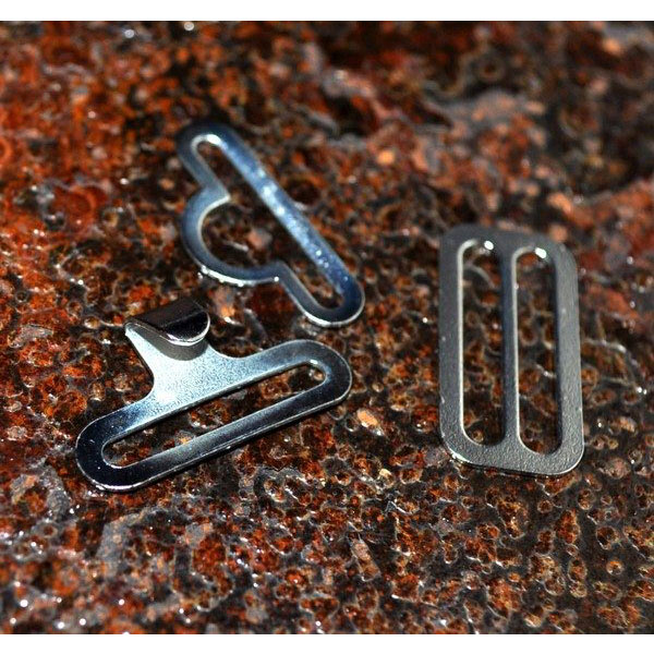 Vasta gamma di fibbie metalliche con chiusura da applicare su qualunque tessuto o pellami. Disponibili nei colori standard: nickel, brunito, ottone lucido.